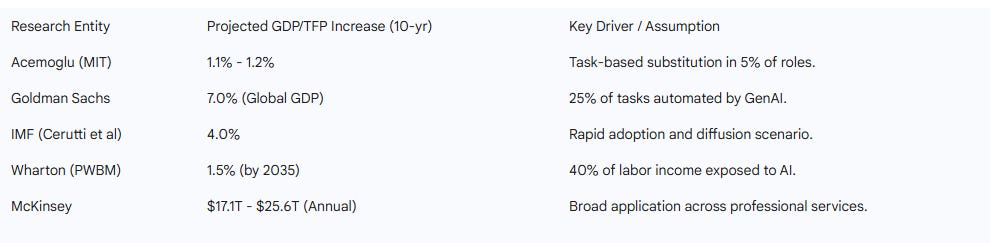 Economists offer a wide range of estimates regarding the total factor productivity (TFP) boost provided by AI. Conservative models, such as that of Daron Acemoglu (2024), project that AI will increase US GDP by a modest 1.1% to 1.2% over the next decade, representing an annualized increase of approximately 0.1 percentage points. Acemoglu’s caution stems from the estimate that only 5% of tasks will be profitably automated within 10 years, as AI begins to tackle “hard tasks” such as complex medical diagnosis and nuanced legal judgment.