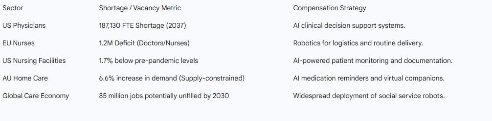 AI as Infrastructure for Continuity: In healthcare (1.2M vacancies), utilities (25% retirements), and infrastructure, AI is not displacing workers but ensuring service continuity when human labour is unavailable.