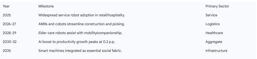 The realization of AI as compensatory capacity depends on the technical maturity of robotics and agentic systems. The decade from 2025 to 2035 is projected to be the “Decade of mass integration”.